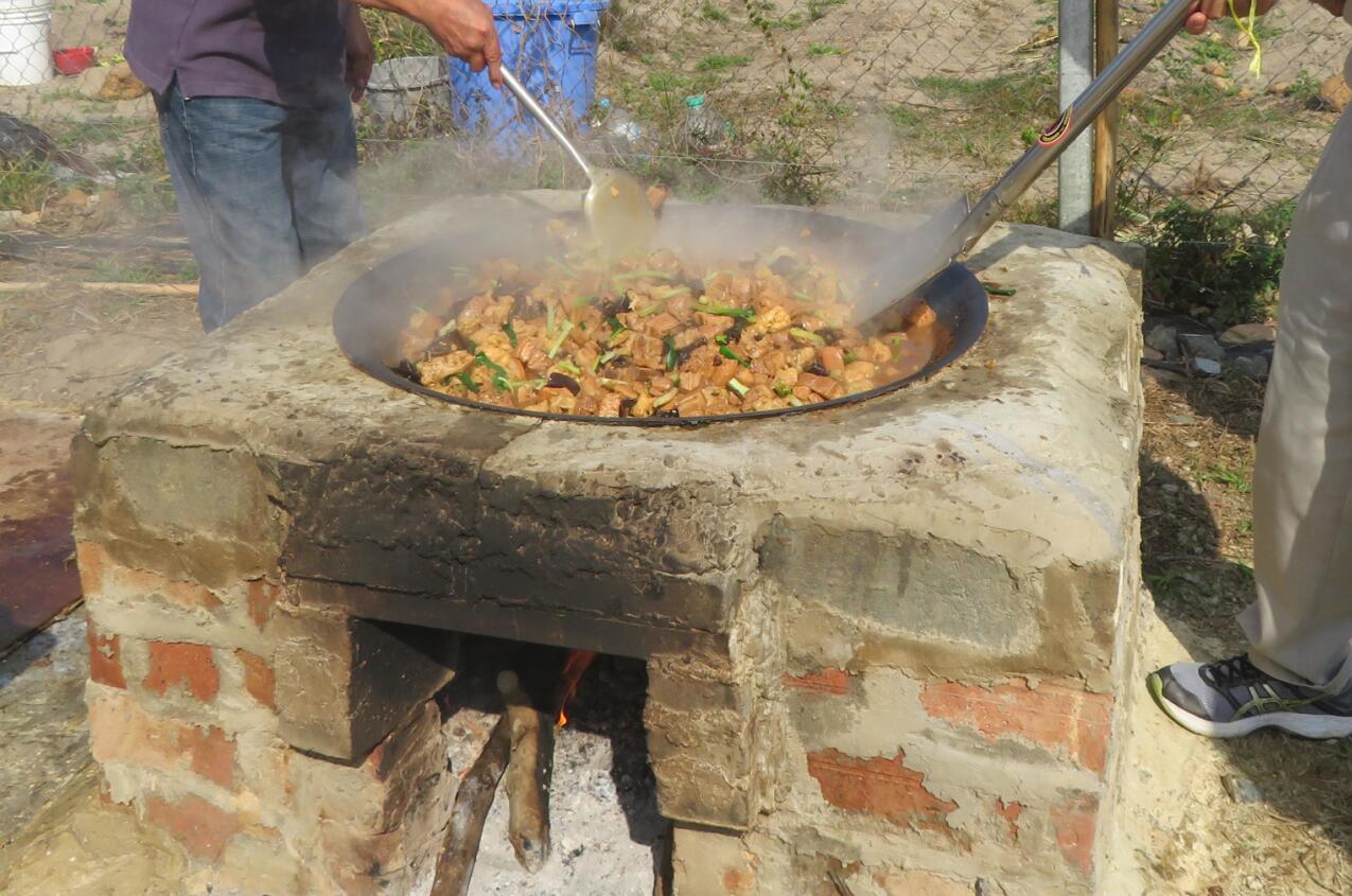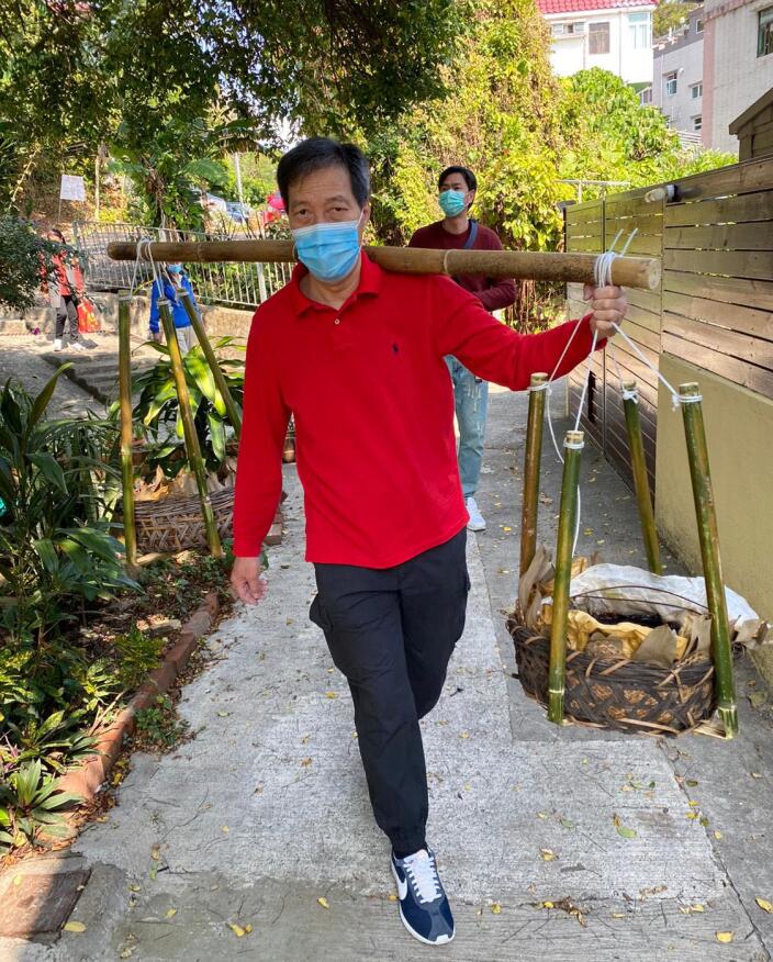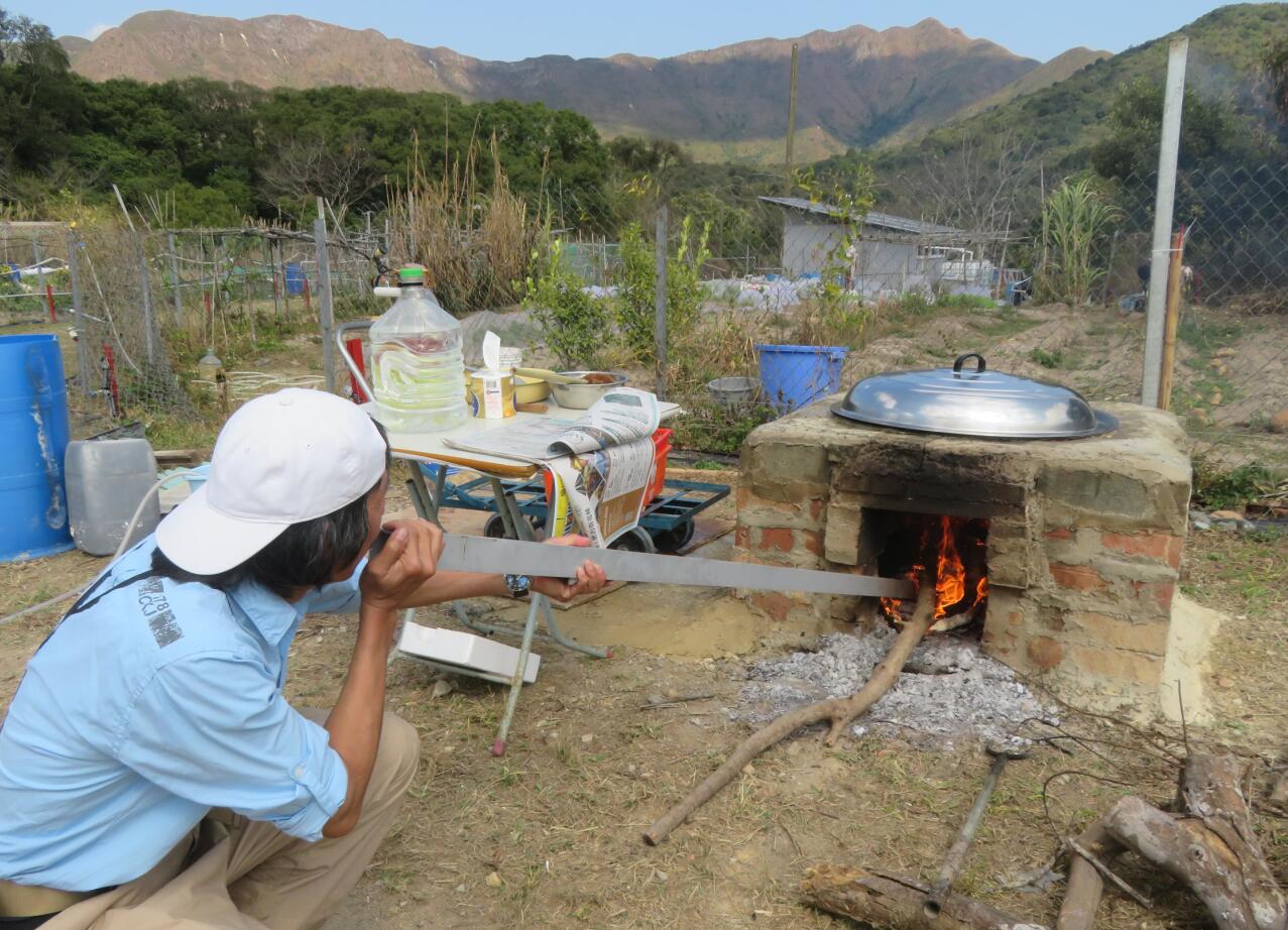 這條客家村幾近荒廢,近年一些村民致力復村,想找回「村落的味道」,試過炆豬肉兩次,但分量不多,只是十來斤。而辛丑年這一趟大陣仗得多,豬肉多達50斤。炆好的豬肉,除村民享用,亦拿到祠堂酬神。主廚是村民明哥,前兩次也有份參與,今次就成為掌舵人。有謂工欲善其事,必先利其器,有精於工程的村民特別造了一個可放大鑊的爐灶,打地台砌了三層磚,以黃泥隔熱,旁邊還有煙囪。此外,購置大鑊及鑊蓋,預先撿拾大堆枯木作燃料,其中有樟木。