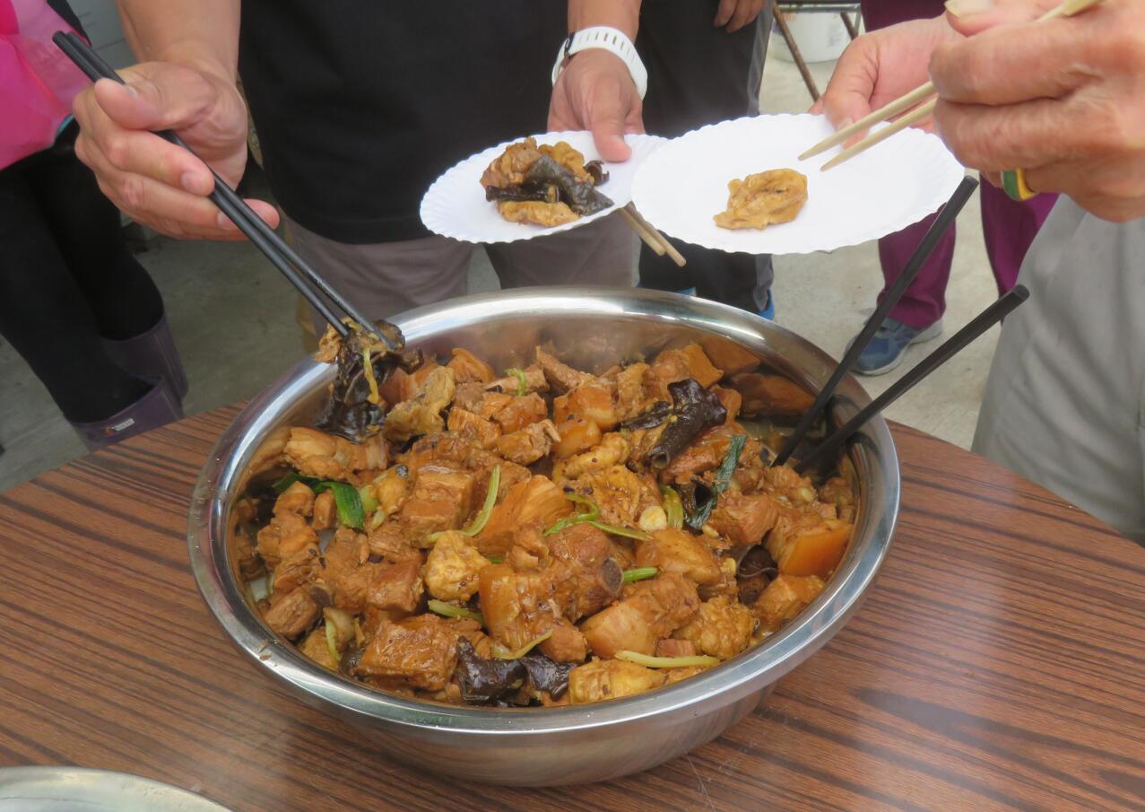 村民面對香氣四溢的炆豬肉,大都吃個不停,並讚賞味道很好,轉瞬已吃得七七八八。明哥說,現代人注重健康,他們這一代炆豬肉也沒那麼重口味,他沒有加鹽,因覺醬料已夠味道。他指,炆豬肉不能一味用大火,否則肉會很乾,不嫩口。烹煮初段、中段及後段,大火後要細火,特別是最後階段,已落很多配料如豆卜很吸水,要用細火,否則煮乾水會不好吃。因此用柴多少要時刻看顧。他又謂大家吃得開心之餘,也要煮得開心,炆豬肉涉及很多人手,大家分工合作,才能順利完成,因此亦有助聯繫感情。(記者 鄭玉君)