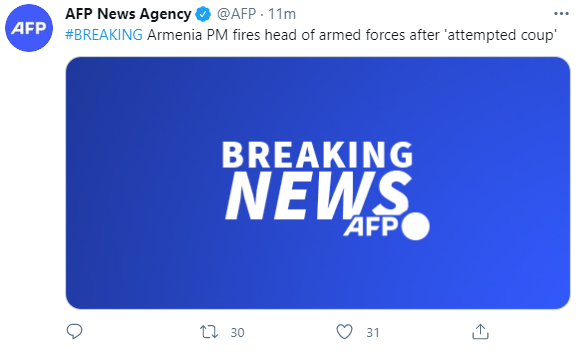 帕希尼揚稱總參謀部的聲明是意圖發動軍事政變,他呼籲支持自己的民眾立刻到共和國廣場集合,並表示將準備進行直播講話。