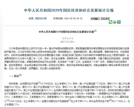 公報指,初步核算,全年國內生產總值1015986億元,比上年增長2.3%。其中,第一產業增加值77754億元,增長3.0%;第二產業增加值384255億元,增長2.6%;第三產業增加值553977億元,增長2.1%。第一產業增加值佔國內生產總值比重為7.7%,第二產業增加值比重為37.8%,第三產業增加值比重為54.5%。全年最終消費支出拉動國內生產總值下降0.5個百分點,資本形成總額拉動國內生產總值增長2.2個百分點,貨物和服務淨出口拉動國內生產總值增長0.7個百分點。分季度看,一季度國內生產總值同比下降6.8%,二季度增長3.2%,三季度增長4.9%,四季度增長6.5%。預計全年人均國內生產總值72447元,比上年增長2.0%。國民總收入1009151億元,比上年增長1.9%。全國萬元國內生產總值能耗比上年下降0.1%。預計全員勞動生產率為117746元/人,比上年提高2.5%。