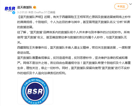 據藍天救援官微消息,近期,有關於西藏冒險王王相軍死亡原因及救援進展被網絡上炒作的沸沸揚揚,個別組織、個人為達目的參與其中,甚至冒用藍天救援隊名義「分析「所謂的救援進展。