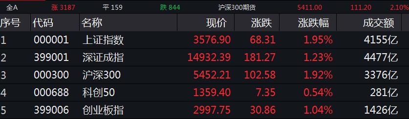 3日,A股三大指數全線低開,盤面上,白酒概念股領跌,環保工程、數字貨幣等板塊跌幅居前,鈦白粉開盤走高。隨後,指數小幅回暖,滬指翻紅 ,創指、深成指跌幅縮窄,鋼鐵、有色冶煉加工、煤炭概念等板塊拉升衝高,國防軍工、白酒概念等下挫明顯。總體來看,市場情緒偏向謹慎,賺錢效應一般。盤中,兩市股指走勢分化,創指跌近0.6%,銀行股、航運概念股異動拉升,第三代半導體、環保工程等下挫明顯。臨近午盤,指數全線上揚,滬指漲幅擴大至1%,深成指、創指先後翻紅,農機板塊、廣電系快速拉升,汽車股、保險股全線飄紅,市場情緒逐漸升溫,兩市逾2400股上漲。午後,指數延續紅盤震盪,滬指漲逾1.4%,鋼鐵、鈦白粉板再度爆發,銀行股、碳中和概念持續發力。總體來看,市場交易情緒高漲,兩市逾2600股上漲,賺錢效應較好。臨近尾盤,指數再度上揚,創指、深成指漲幅擴大至1%,稀土永磁拉升衝高。