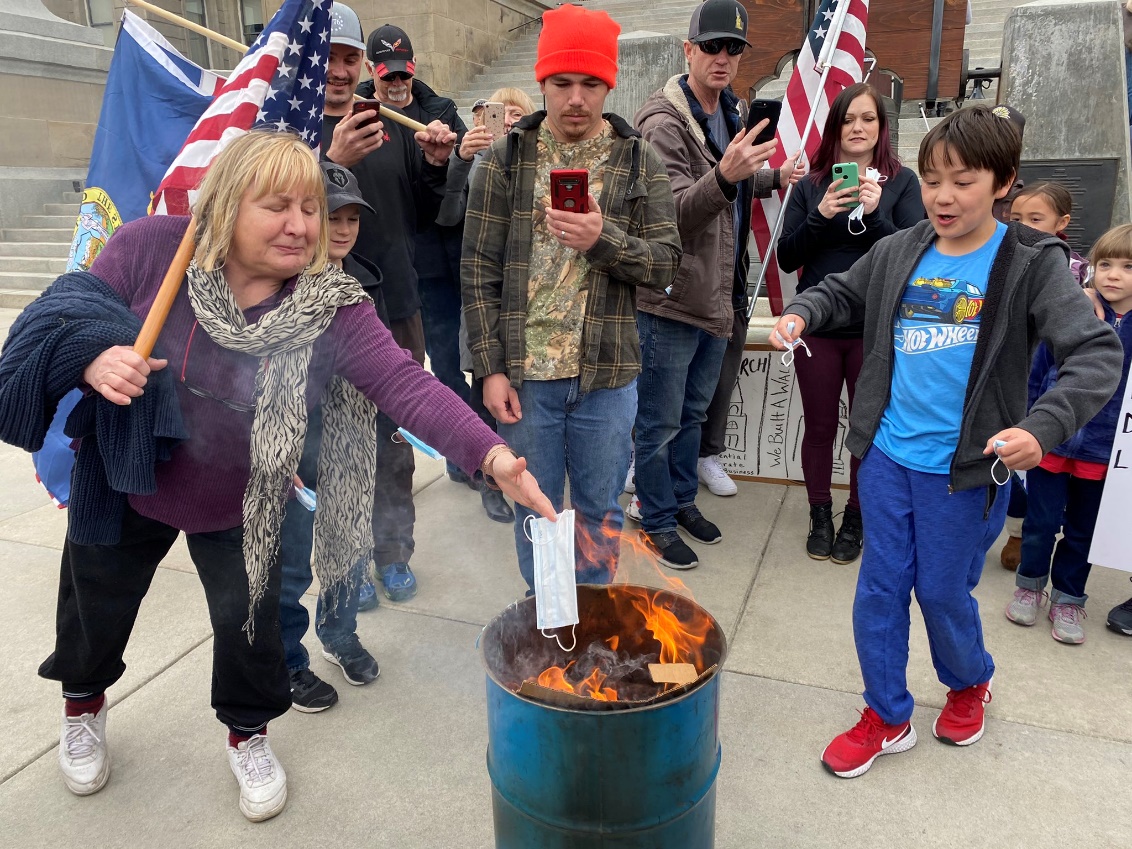 據美國《國會山報》報道,當地時間6日,美國愛達荷州約100名家長及子女在議會大樓外舉行「燒口罩」活動,聲言反對地方政府強制民眾戴口罩抗疫。小朋友高呼要摧毀口罩,又問火種「餓不餓」,然後把口罩掉進火堆,站在後方的成年人則為他們加油。