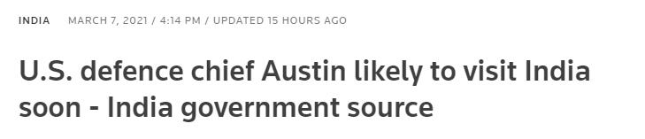 消息人士補充說,奧斯汀訪印之行將聚焦加強兩國合作,奧斯汀計劃在3月15日與印度國防部長辛格會面。此前還有消息稱,奧斯汀將與美國國務卿布林肯一起訪問日本和韓國。目前尚不清楚布林肯是否也將訪問印度。