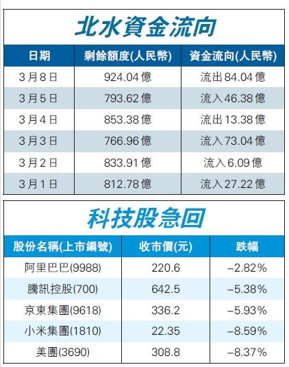 港股通北水8日淨賣出132億元港股,為歷來走資金額第二高。騰訊、美團走資明顯,全日分別遭北水減持29.8億元和25.6億元,五大北水成交股份中,中移動(941)為唯一錄得北水淨買入的港股,吸資2.29億元。美圖(1357)上周五斥資4000萬美元(折合約3.12億港元),在公開市場交易中購買1.5萬單位的以太幣與379.121單位的比特幣。該股昨天升逾一成後倒跌逾半成,收報2.54元跌6.2%。藍籌方面,吉利(175)挫9.4%;中移動回吐1.1%。相反,國際油價持續造好,「三桶油」逆市升1.4%至4.1%。
