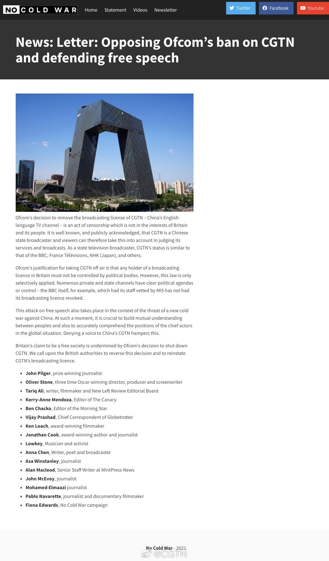 3月9日,多位國際知名人士在英國《晨星報》和「拒絕新冷戰」機構官方網站聯合發表署名公開信,反對英國通訊管理局對中國國際電視台(CGTN)的禁令。參與此次聯名的包括澳大利亞著名戰地記者、電影導演約翰·皮爾格(John Pilger),三次獲得奧斯卡獎的導演、製片人、編劇奧利佛·斯通(Oliver Stone)以及英國電影學院獎終身成就獎得主肯·洛奇等多位知名人士,包括在英國享有一定聲譽的作家、記者編輯、電影人、音樂人等。