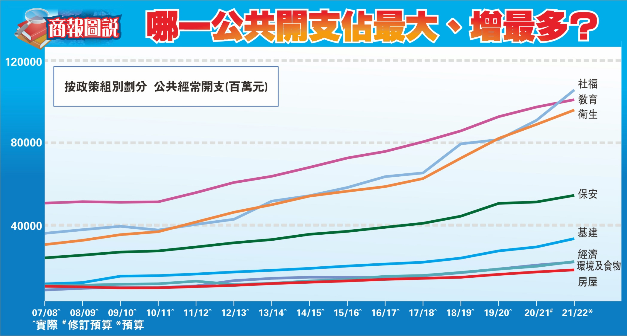自2007/08年度以後,公共開支開始顯著增加。由於人口老化,查期內增幅最大的,乃是累增214%的衛生,而受惠不斷加推加強利民措施,社福也緊隨其後累增194%,並於新年度首次超越教育,成為最大開支項目。不過,這不代表教育開支縮減,雖然近年香港出生率下降,期內相關開支也翻了一倍。