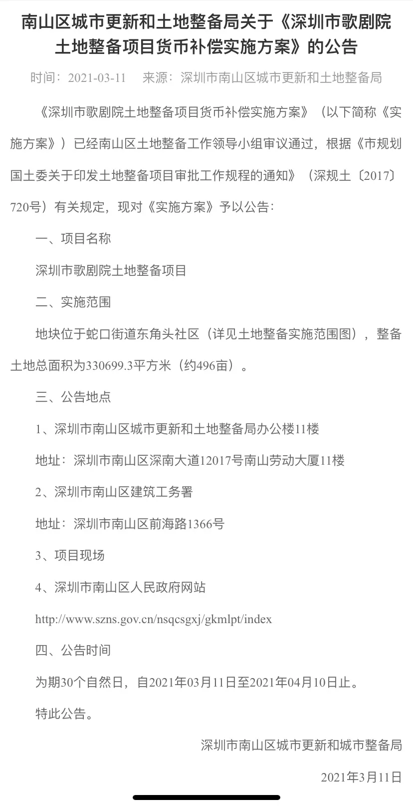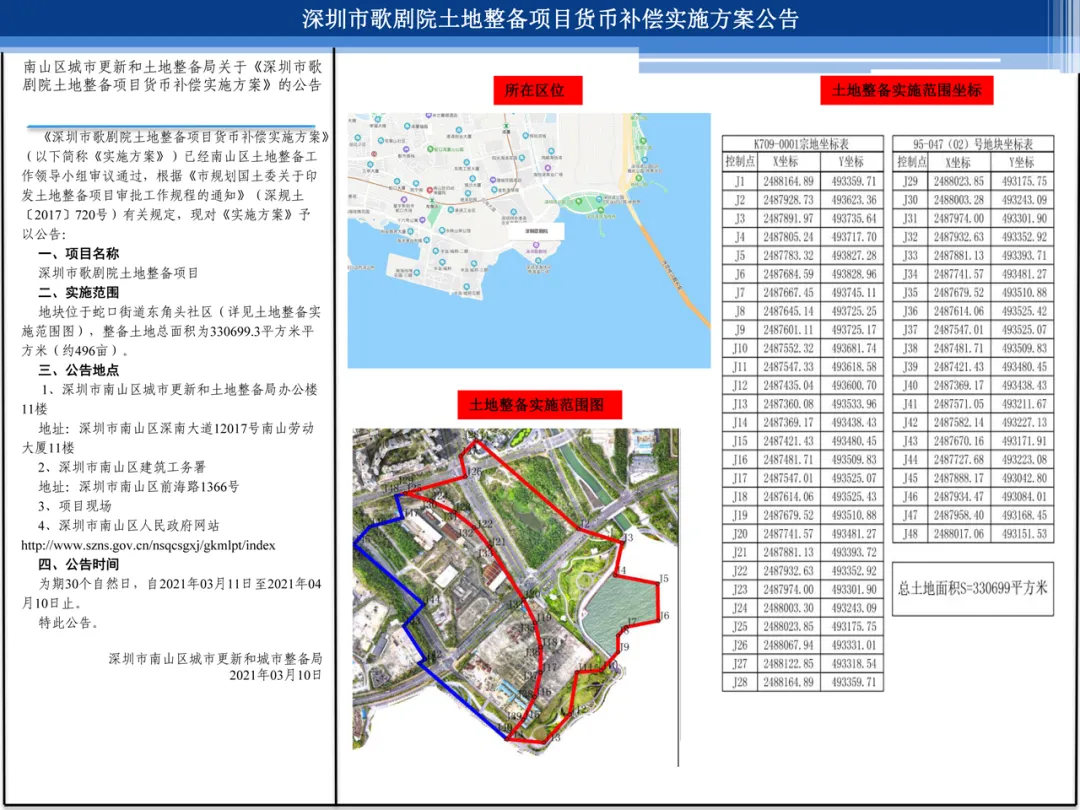 3月11日,南山區城市更新和土地整備局發布公告,《深圳市歌劇院土地整備項目貨幣補償實施方案》已經南山區土地整備工作領導小組審議通過。公告時間從11日起,持續至4月10日止。