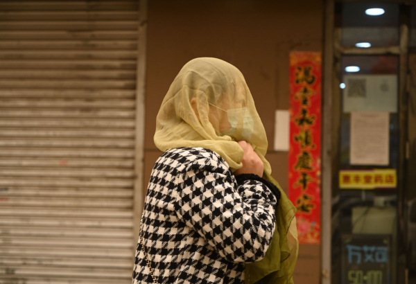 3月15日,呼和浩特街頭,一位女士頭裹紗巾出行。中新社圖片