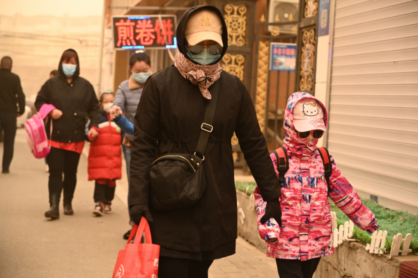 3月15日,呼和浩特街頭,家長和小朋友戴著墨鏡、口罩出行。中新社圖片