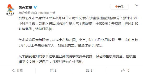 據包頭市互聯網信息辦公室官方微博15日消息,經包頭市教育局黨組研究,決定包頭市幼兒園、小學、初中3月15日放假一天,高中學校3月15日上午先放假半天,視情況再定。望全體家長周知。