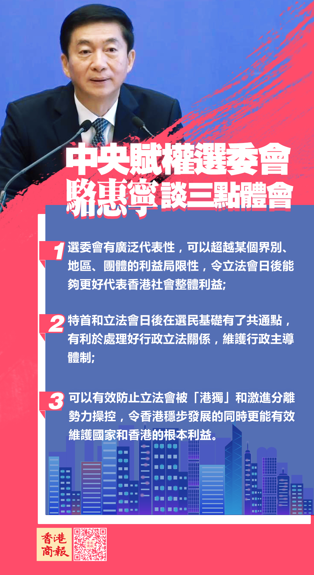 駱惠寧表示,要正確理解「賦予選舉委員會選舉產生較大比例的立法會議員」的必要性、合理性。一是選委會具有廣泛代表性,可超越某個界別、某個地區、某個團體的利益局限性,使立法會更好地代表社會整體利益;二是這樣行政長官和立法會的選民基礎就有了共同點,有利於處理好行政立法關係,維護行政主導體制;三是也可以有效地防止立法會被「港獨」和激進分離勢力操控或搅局,將有效維護國家及香港根本利益。