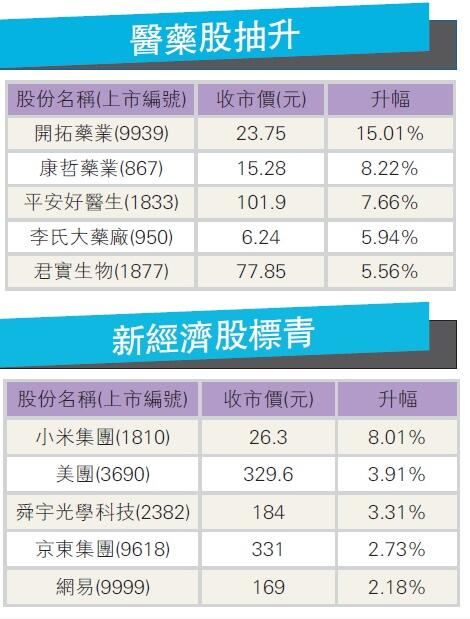 醫藥股造好,石藥(1093)去年多賺39%,全日飆5.1%;藥明生物(2269)急揚5.5%;中生製藥(1177)升3.4%;16日公布業績的康哲藥業(867),全日炒高8.2%。