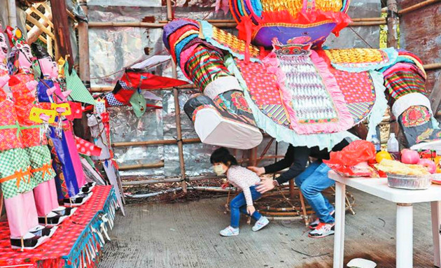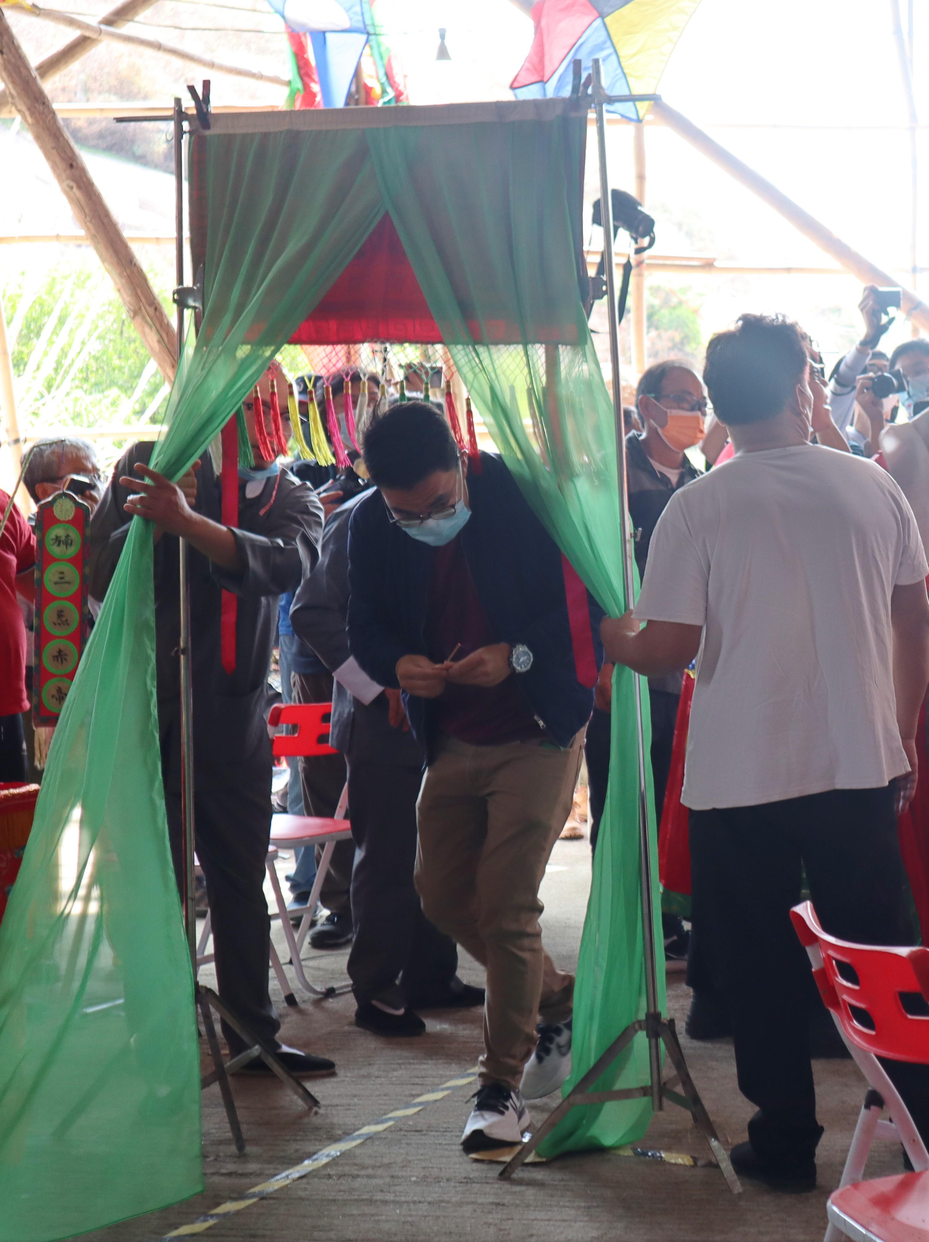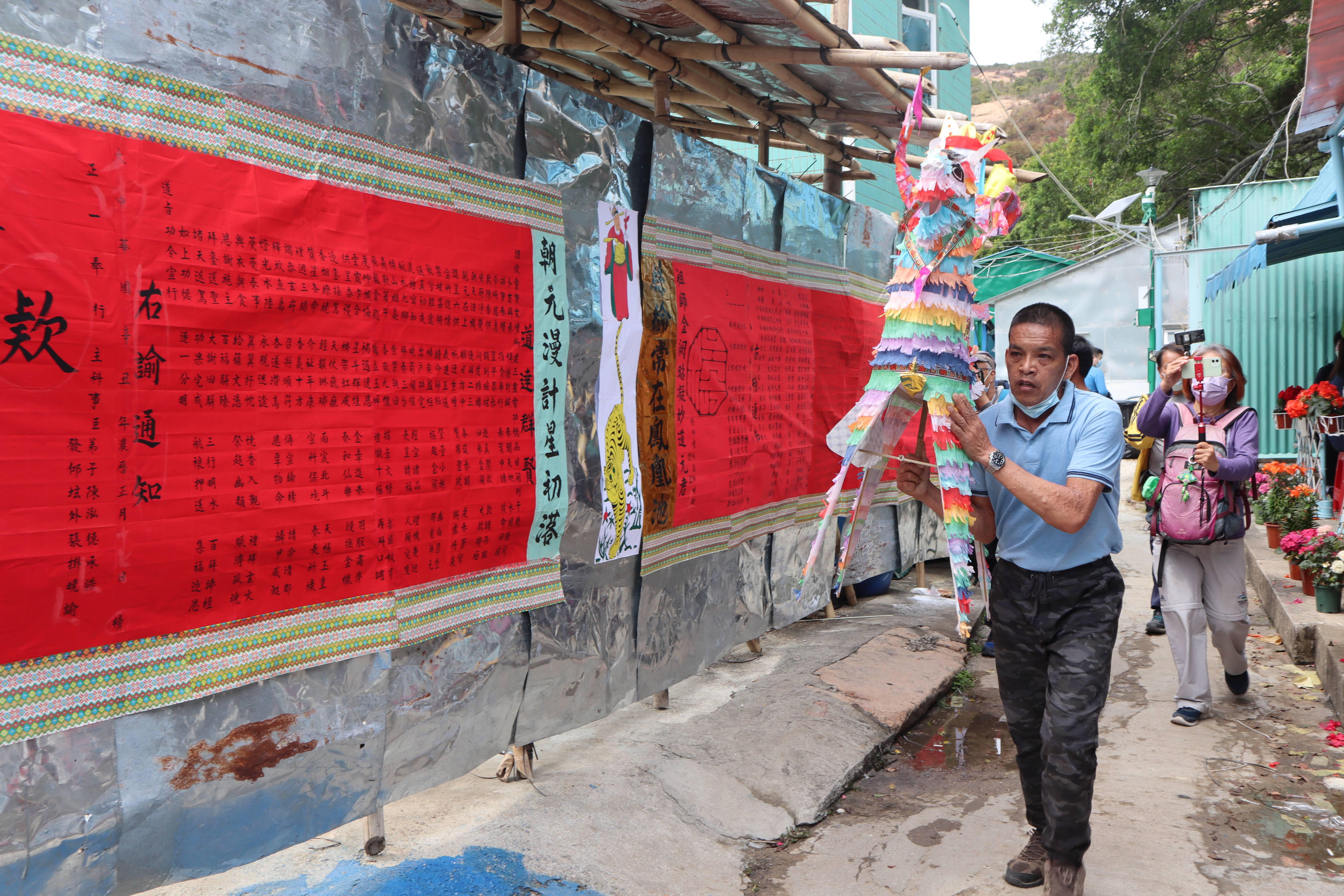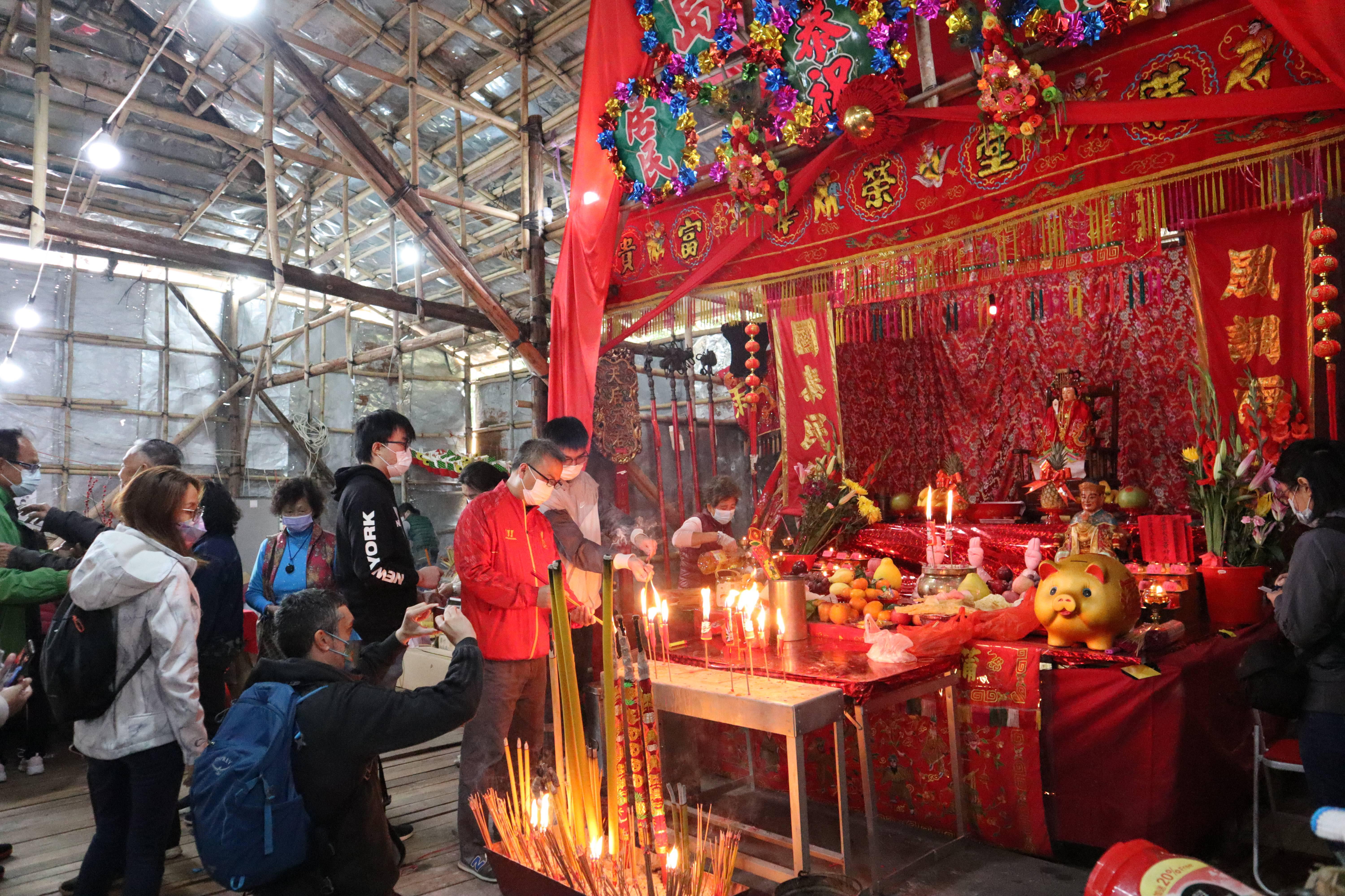 這個原本都算小的醮棚,今年更小。蒲台島值理會委員、村委會主席羅成說,今年因疫情限制人流,沒有神功戲上演,戲台只擺放一部電視機播放粵劇;齋菜宴亦大減,上屆正醮日午間有一百圍,晚上亦有四五十圍,但今年只可煮點齋菜給參與醮會的善信,還要保持距離以自助形式祭五臟廟,由此醮棚縮細五分一。總計正醮日人流只有三四百人,較上屆的逾千人次,減幅逾半。
