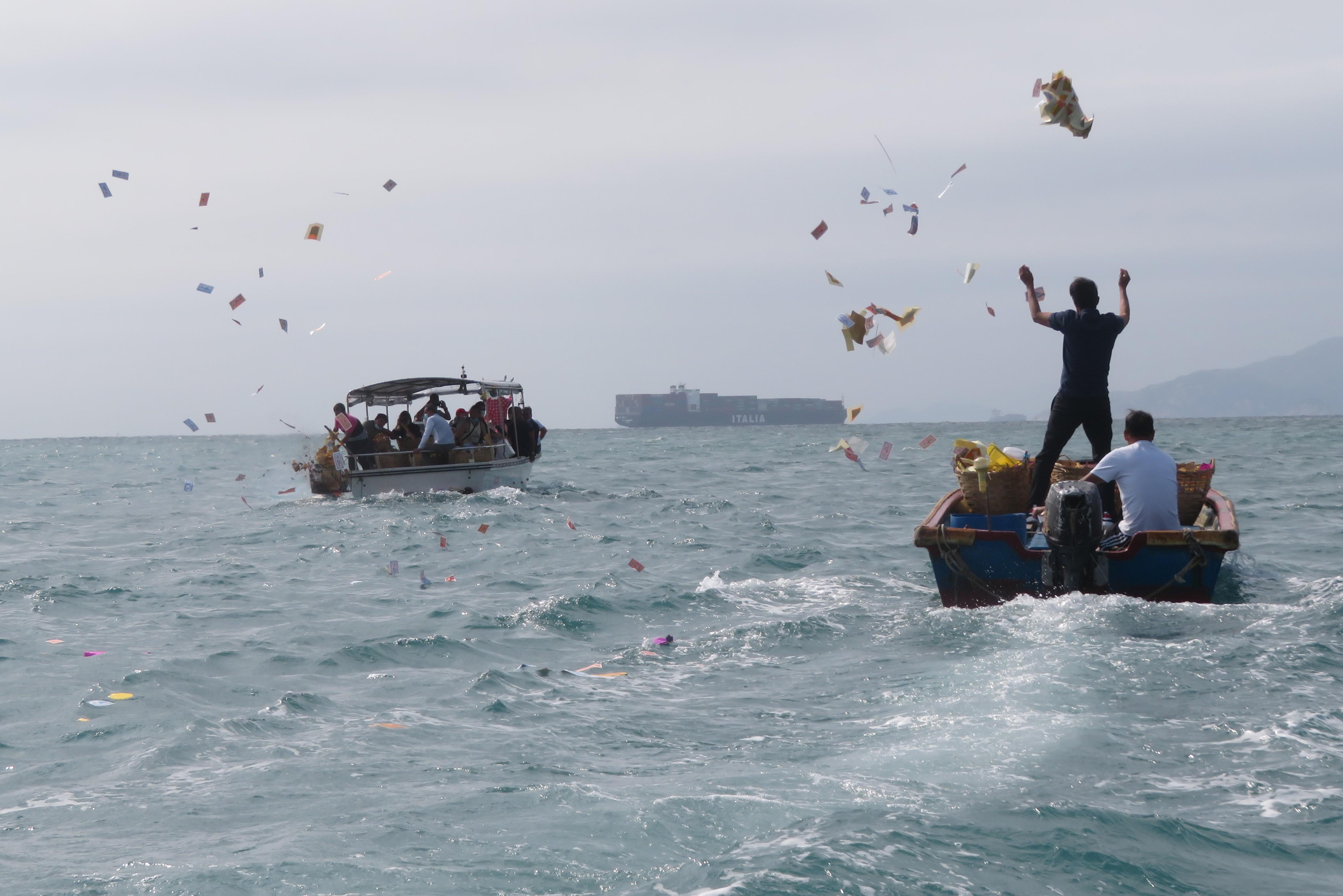 運載衣紙的小艇尾隨水幽船,不時將衣紙拋落海。
