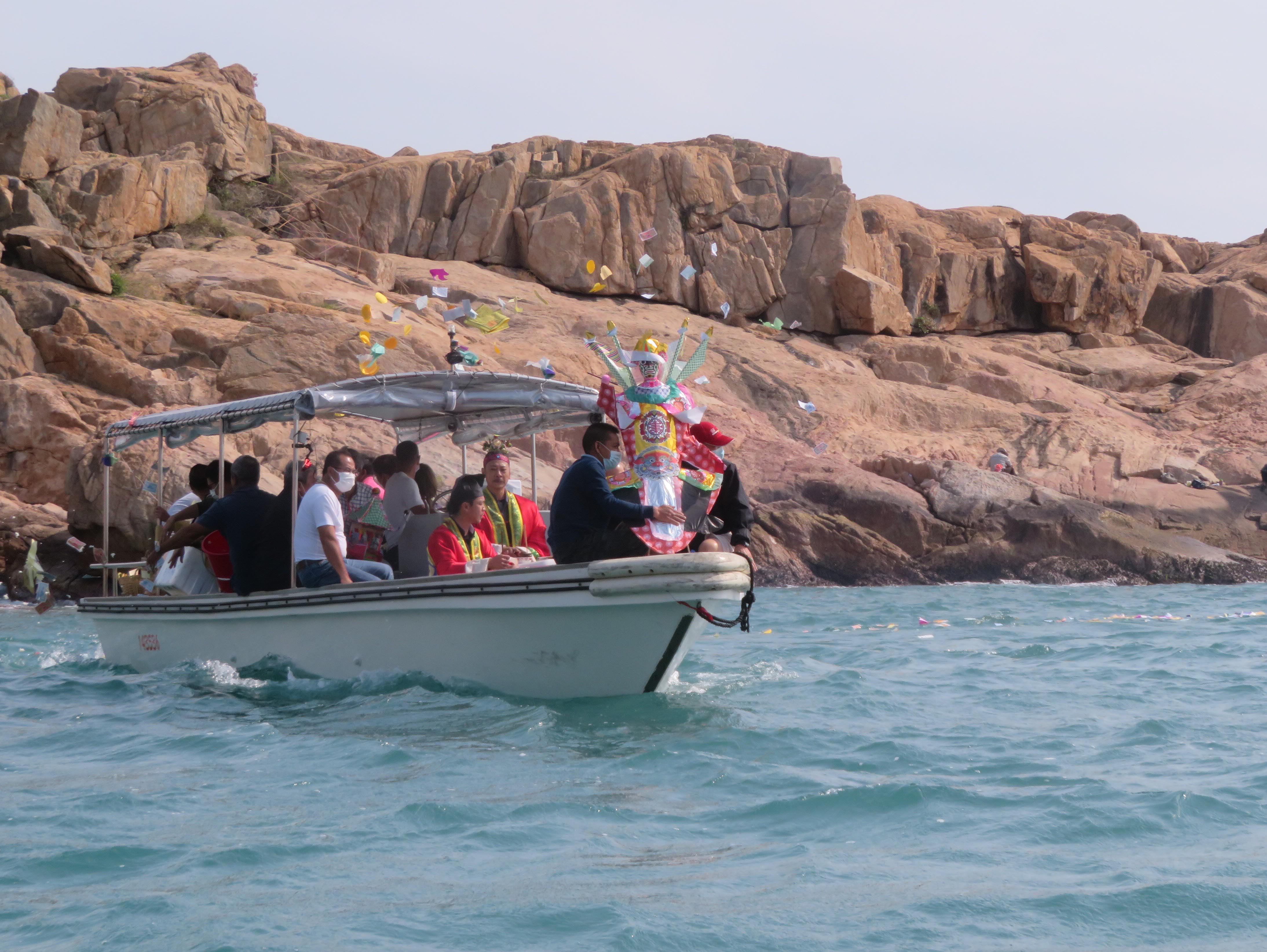 緊接過關的水幽在下午2 時半開始,值理會成員聯同喃嘸師傅乘船出海,兩成員坐在船頭拿住紙扎細鬼王。祭水幽船由大灣出發,經過墨洲海面到南角咀,再返回大灣,全程約一個半小時。途中,一些坐在船尾及船邊的成員不時化寶及倒灑祭品如飯,喃嘸師傅則進行唸經等儀式,施祭海中幽魂,祈求水陸平安。(記者 鄭玉君)
