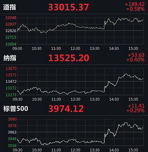 截至收盤,道指漲189.42點,漲幅0.58%,報33015.37點;納指漲53.63點,漲幅0.40%,報13525.20點;標普500漲11.41點,漲幅0.29%,報3974.12點。