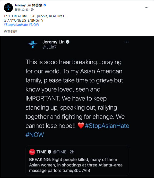 近日,美國亞特蘭大發生針對亞裔群體的惡性槍擊案已經導致8人死亡,引發社會極大憤怒。作為在全球知名度很高的亞裔球星,林書豪在社交媒體上為亞裔群體發聲吶喊,林書豪表示,「我們必須站出來,大聲去說出來,團結起來去爭取改變,我們不能放棄希望。我不要再從媒體上了解對兇手來說這是糟糕的一天說法。要跟我說說受害者的事情,他們不應該受到這種待遇。」