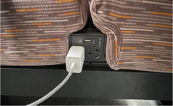 復興號不僅增加了充電口數量,還新增了USB接口。二等座電源位置在相鄰兩個座墊中間,扶手下方處。