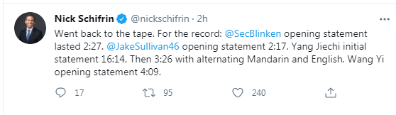 據美國公共電視台記者現場統計,美方兩名代表發言時間都約2分多鐘,但中方代表楊潔篪的發言時間則長達19分40秒,王毅的發言時間為4分零9秒。