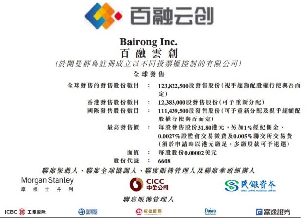 19日,人工智能技術平台百融雲創在港交所發布公告,申請通過香港IPO全球發售1.238億股股票,每手買賣單位500股,計及手續費,每手入場費約16060元。最高發行價為每股31.80港元,股票代號「6608」。