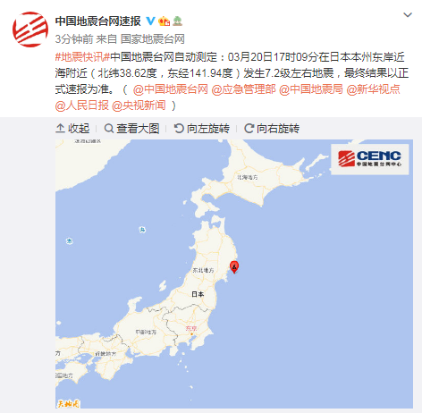 中國地震台網自動測定:03月20日17時09分在日本本州東岸近海附近(北緯38.62度,東經141.94度)發生7.2級左右地震,最終結果以正式速報為准。