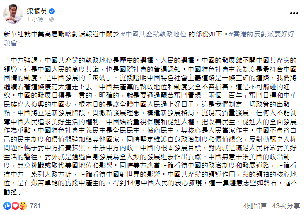 全國政協副主席、香港前特首梁振英今日(20日)下午6時在社交媒體發文,呼籲香港反對派好好領會新華社就中美高層戰略對話報道中關於中國共產黨執政地位的部分內容,提醒反對派人士認清形勢,認真領會中央維護中國共產黨執政地位的堅定決心。