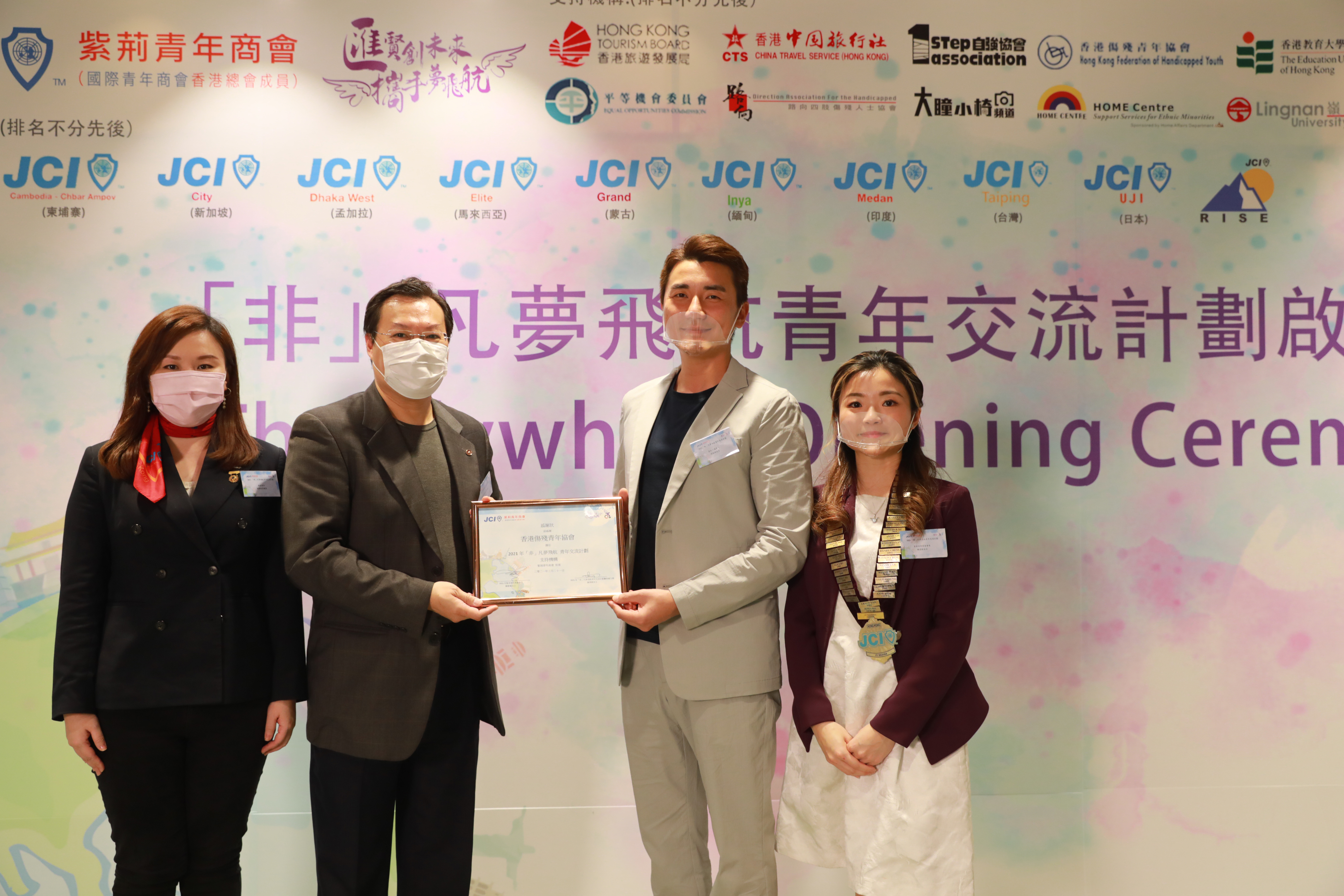 國際青年商會總會會長楊穎琳、紫荊青年商會會長賴嘉敏、星級旅遊達人洪永城和香港傷殘青年協會行政總監劉家倫的合照。