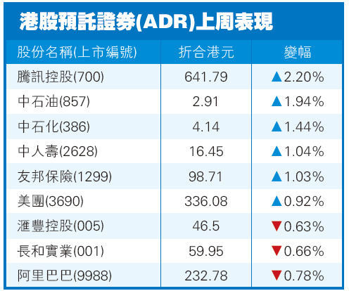港股美國預託證券(ADR)普遍向好,按比例計算,收報29150點,較港收市升162點。騰訊(700)ADR折合報641.79元,較港股收市升2.2%。控(005)ADR折合報46.48元,較港收市低0.6%。另外,港股本周將迎來業績期高峰,其中股王騰訊本周三(24日)公布全年業績。
