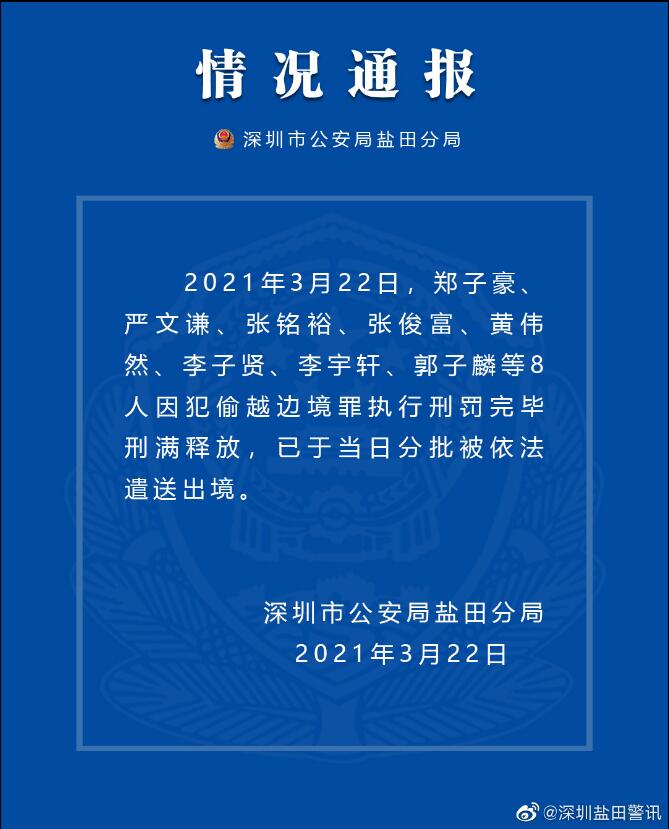 據深圳市公安局鹽田分局發布的「情況通報」顯示,2021年3月22日,鄭子豪、嚴文謙、張銘裕、張俊富、黃偉然、李子賢、李宇軒、郭子麟等8人因犯偷越邊境罪執行刑罰完畢刑滿釋放,已於當日被依法遣送出境。