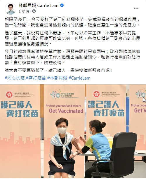 行政長官林鄭月娥22日晚在社交媒體發文表示,她今日在相隔28日後打了第二針科興疫苗,完成發揮疫苗的保護作用。一段時間後她會安排檢測體內抗體,確定已產生免疫力。