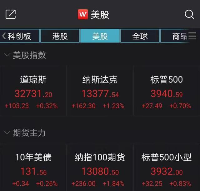 截至收盤,道指漲103.23點,漲幅0.32%,報32731.20點;納指漲162.31點,漲幅1.23%,報13377.54點;標普500指數漲27.49點,漲幅0.70%,報3940.59點。