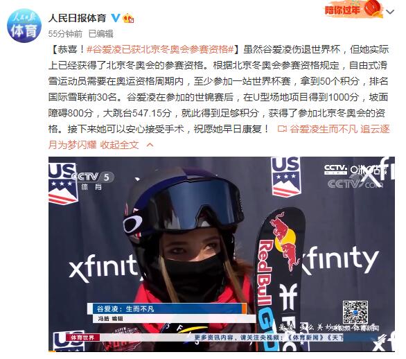 據人民日報社體育部官方微博今日消息,谷愛凌已獲北京冬奧會參賽資格。