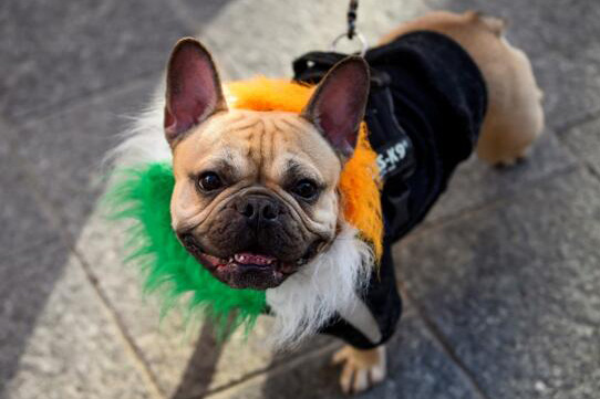 當地時間3月17日,在愛爾蘭都柏林的聖帕特里克節上,一隻法國鬥牛犬穿着節日服裝,隨主人參加活動。