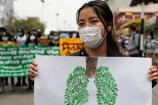 當地時間3月19日,在尼泊爾加德滿都,環保活動人士手持標語牌參加抗議政府修建尼加德國際機場的活動,因為修建機場會導致砍伐許多樹木,影響該地區的生物多樣性。