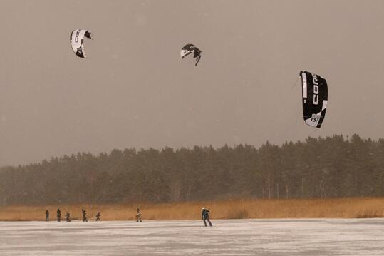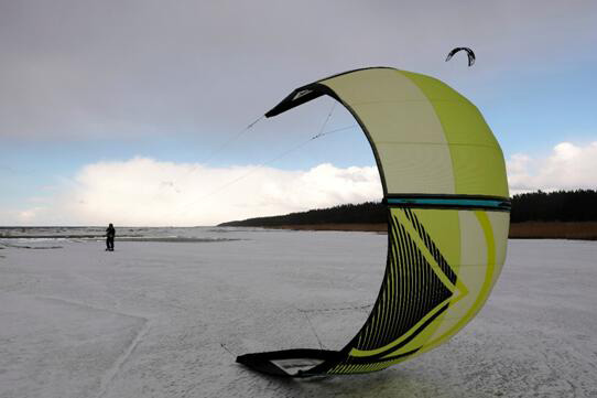 當地時間 3月19日,在拉脫維亞,人們在冰面上玩滑翔傘。