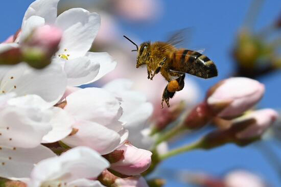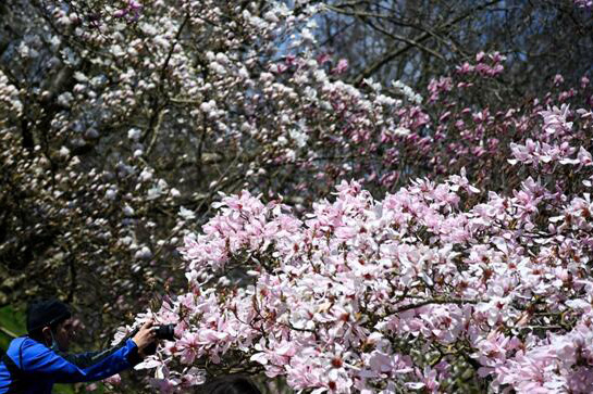 當地時間3月22日,在英國倫敦,遊客們在皇家植物園觀賞和拍攝盛開的玉蘭花。一隻蜜蜂也來湊熱鬧,在花間徘徊。