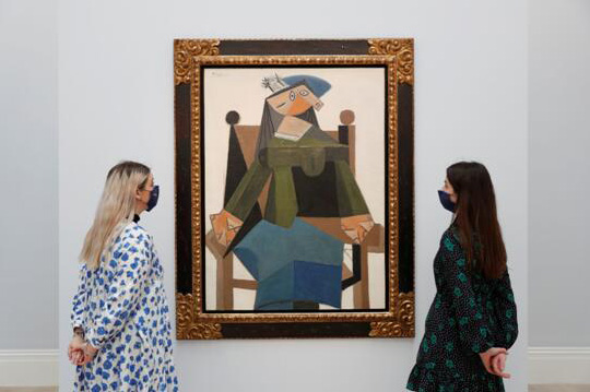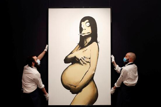 當地時間3月22日,在英國倫敦,蘇富比的工作人員在安放並觀賞藝術畫作。