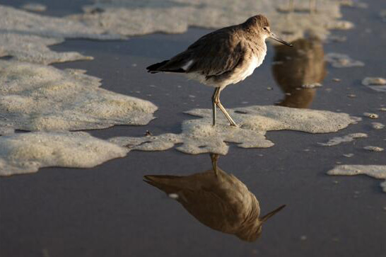 當地時間3月23日,在美國加州聖莫尼卡,一隻鳥兒站在海灘上。但因水質遭到污染,水中泛起灰白色的泡沫。