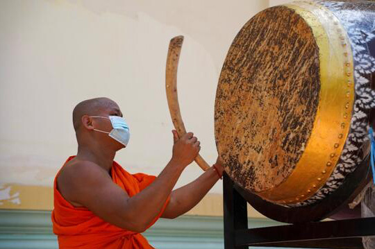 當地時間3月24日,在柬埔寨金邊,一名僧侶在打鼓。柬埔寨首相洪森下令所有佛塔每天敲擊鐘鼓5次,以提醒全民抗疫。