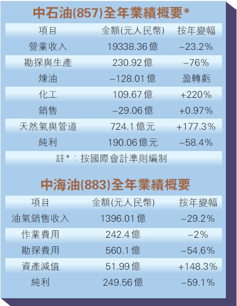 同業中海油(883)截至去年12月底止,純利按年跌59.1%至249.56億元,末期息每股0.25港元。期內,油氣銷售收入為1396.01億元,按年跌29.2%。實現油價每桶40.96美元,跌35%;實現氣價每千立方呎6.17美元,跌近2%。