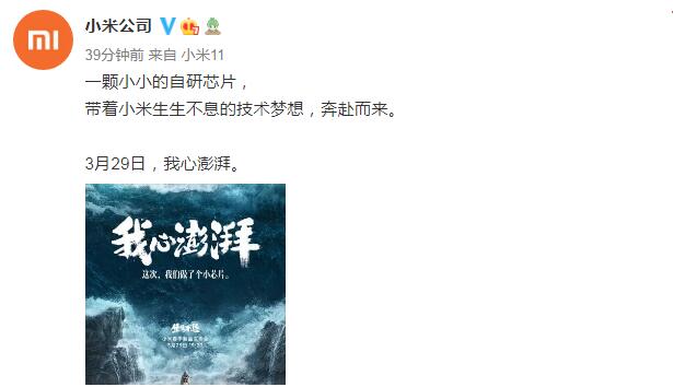 小米公司官方微博今日發布預告,將在3月29日的春季新品發布會上推出新款自研芯片。消息發布後,小米港股股价飙涨,截至發稿时止,其股价报25.45港元,上涨6.49%。