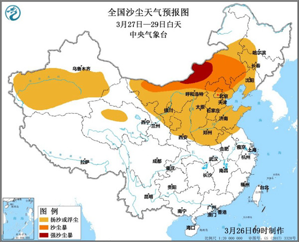 中央氣象台預計3月27日至29日白天,受蒙古氣旋影響,北方地區將出現大範圍沙塵天氣,新疆東部和南疆盆地、青海西北部、內蒙古、寧夏、甘肅中東部、陝西中北部、山西、河北、北京、天津、山東、河南、安徽北部、江蘇北部及遼寧西部、吉林西部、黑龍江西南部等地有揚沙或浮塵天氣,其中,內蒙古中西部和東南部、河北北部、北京北部、遼寧西部等地的部分地區有沙塵暴,內蒙古中部偏北地區有強沙塵暴。期間,內蒙古、華北北部、山東半島、遼寧西部和半島等地將有4~6級風,陣風風力可達7~9級。與3月14日至18日強沙塵暴天氣過程相比,此次沙塵天氣過程強度略弱,沙塵暴影響位置偏東,強沙塵暴範圍偏小,揚沙或浮塵向南傳輸範圍略小。