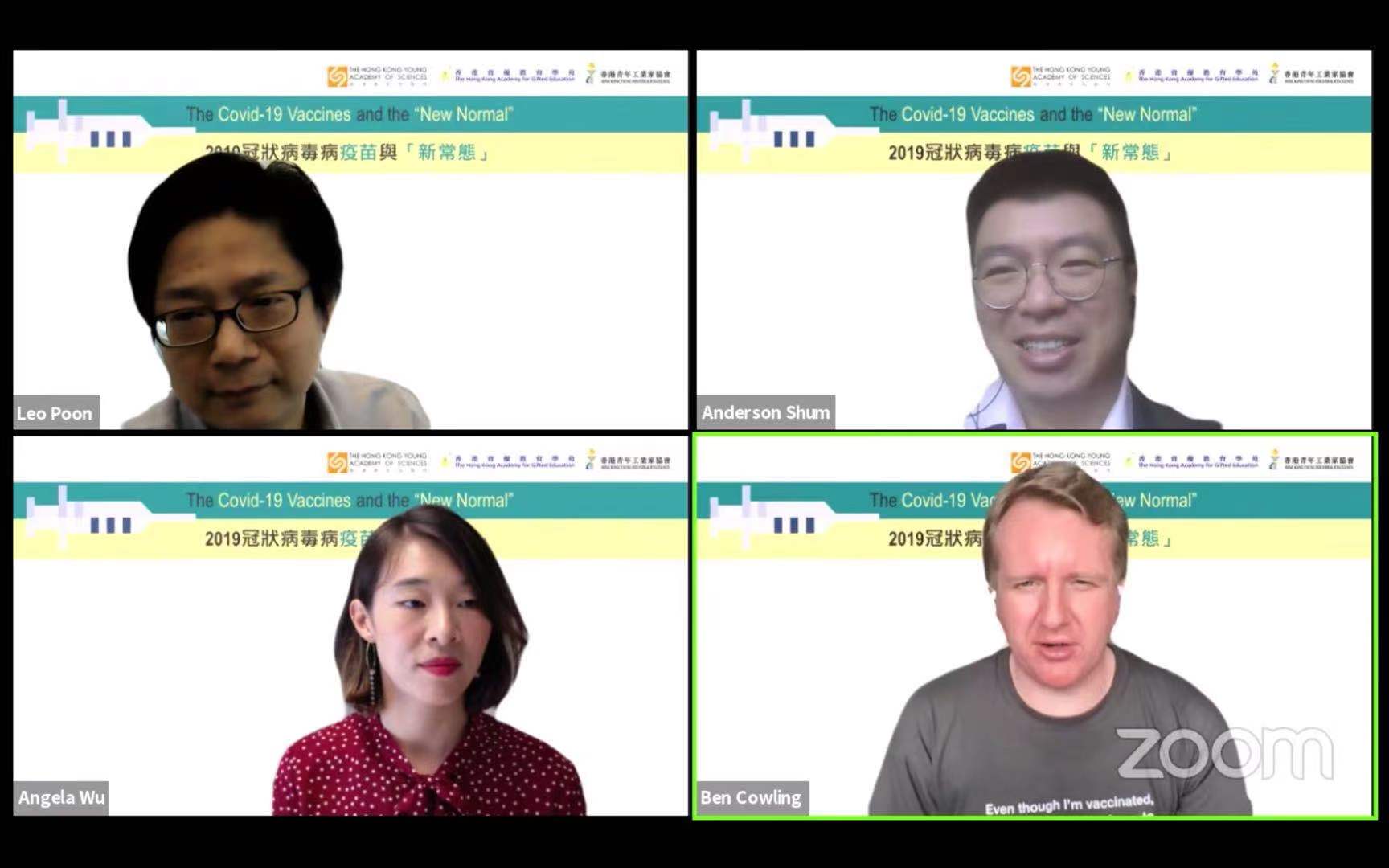 香港青年科學院今日聯同香港資優教育學苑及香港青年工業家協會合辦研討會,開放予公眾參與。三位生物工程及公共衛生領域的專家,包括潘烈文、高本恩及另一位教授吳若昊分享有關新冠疫苗研發、接種及效用等方面的看法,並由香港青年科學院創院院士岑浩璋擔任研討會主持。