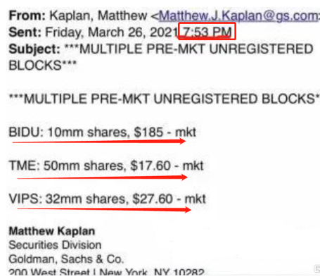 彭博社報道,高盛周五(26日)代理包括中概股的股東,清倉價值105億美元持股,包括中國科技巨頭和美國媒體大鱷在內的公司市值蒸發了350億美元。彭博社取得的電郵顯示,高盛在美國股市開盤前,出售價值66億美元的百度(BIDU)、騰訊音樂(TME)和唯品會(VIPS)股票,全屬中概股。高盛又拋售愛奇藝(IQ)、跟誰學(GSX)股票、ViacomCBS(VIAC)、Discovery(DISCA)和Farfetch(FTCH)股票,價值39億美元。華爾街正猜測神秘賣家的身份,同本周會否再出現大型拋售。