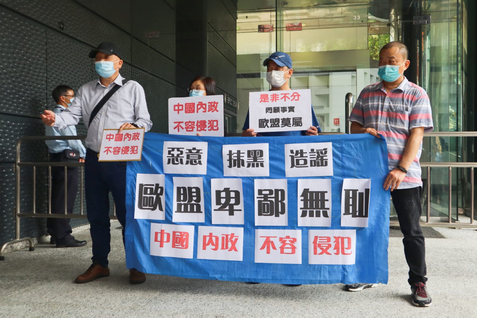 團體「同心護港」今日(29日)到歐盟駐港辦事處請願,抗議歐盟罔顧事實,侵犯中國主權。