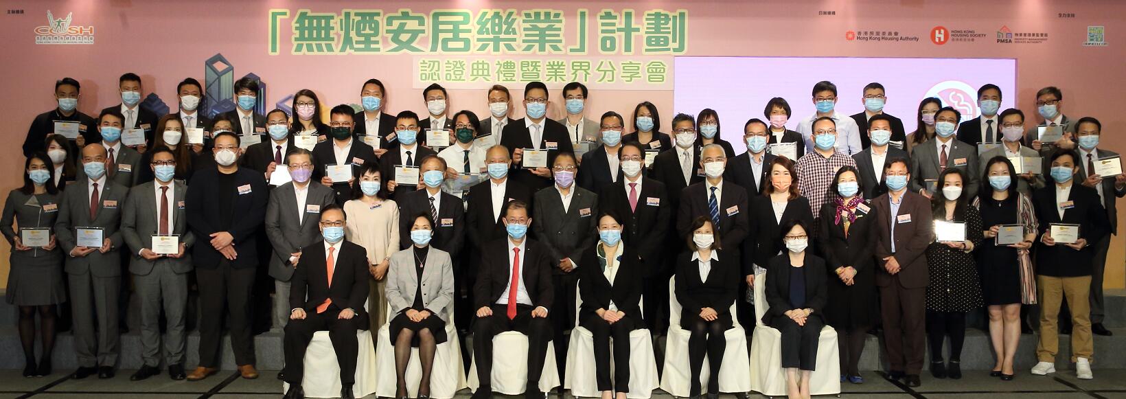 「無煙安居樂業」計劃是去年與香港房屋委員會、香港房屋協會和物業管理業監管局合辦,而認證典禮暨業界分享會的主禮嘉賓包括衛生署控煙酒辦公室主管封螢、房屋署物業管理總經理(支援服務)黎雪葵、香港房屋協會總經理(物業管理)黃潘靜文、物業管理業監管局總經理(營運及服務)陳彧彣、香港吸煙與健康委員會主席湯修齊及副主席陳志球。