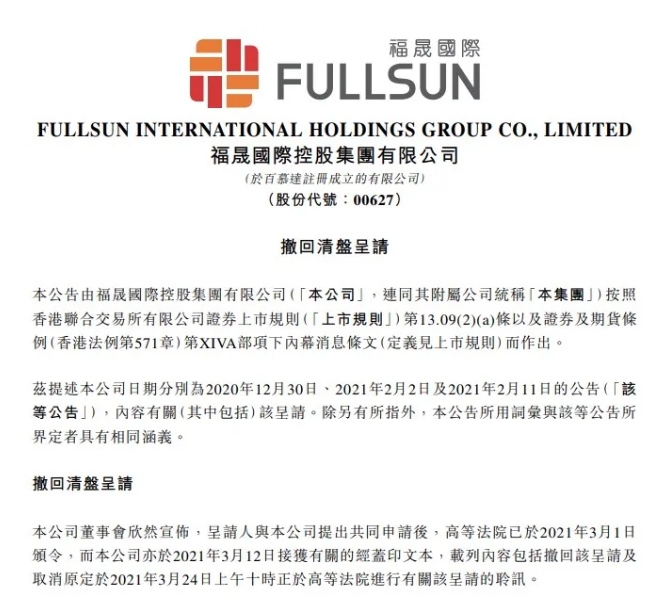 公告指,呈請人與公司提出共同申請後,高等法院已於2021年3月1日頒令,而公司亦於2021年3月12日接獲有關的經蓋印文本,載列內容包括撤回該呈請及取消原定於2021年3月24日上午十時正於高等法院進行有關該呈請的聆訊。