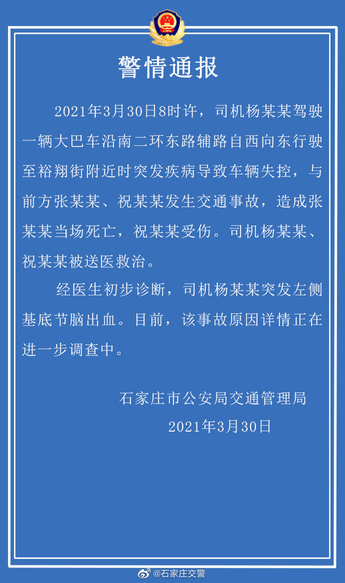 據河北石家莊交警官方微博今日消息,2021年3月30日8時許,司機楊某某駕駛一輛大巴車沿南二環東路輔路自西向東行駛至裕翔街附近時突發疾病導致車輛失控,與前方張某某、祝某某發生交通事故,造成張某某當場死亡,祝某某受傷。司機楊某某、祝某某被送醫救治。經醫生初步診斷,司機楊某某突發左側基底節腦出血。目前,該事故原因詳情正在進一步調查中。