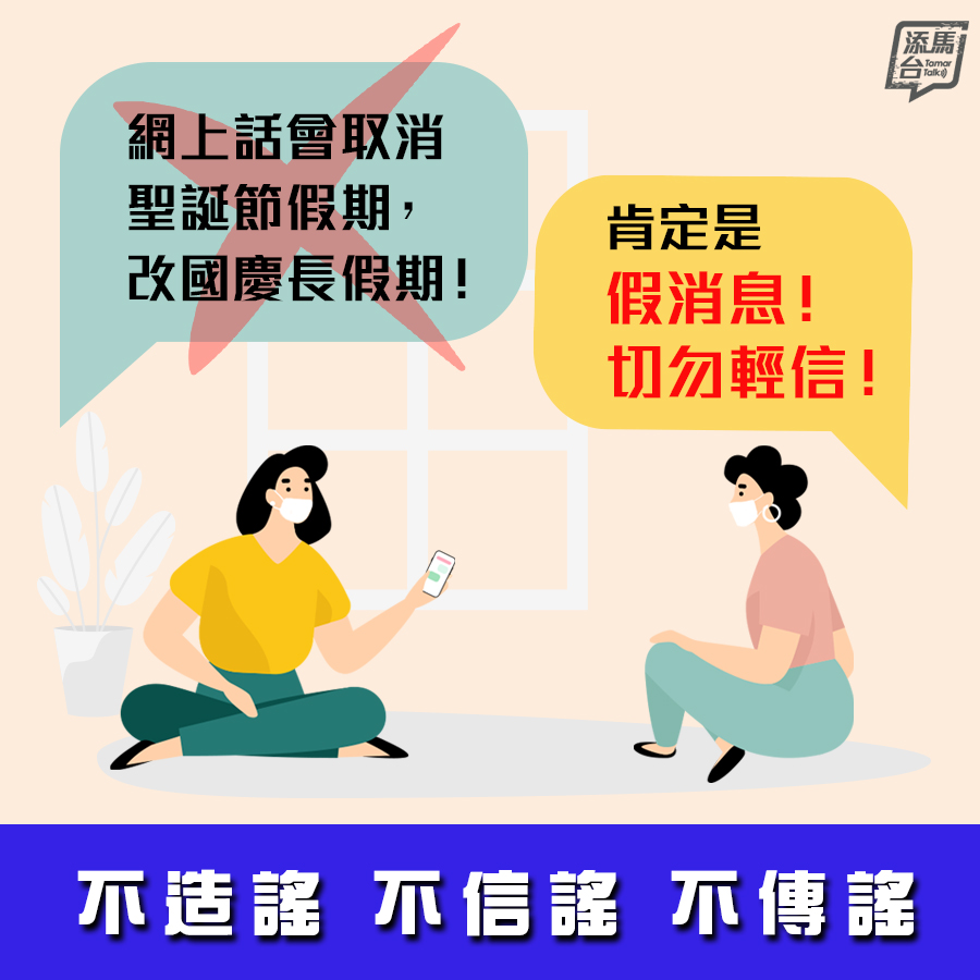 網上近日有人散播假消息,聲稱政府計劃取消聖誕節假期,改推國慶長假期。港府昨日(30日)晚上在社交專頁「添馬台」發文,強調絕無其事,有關帖文的內容全屬虛構。